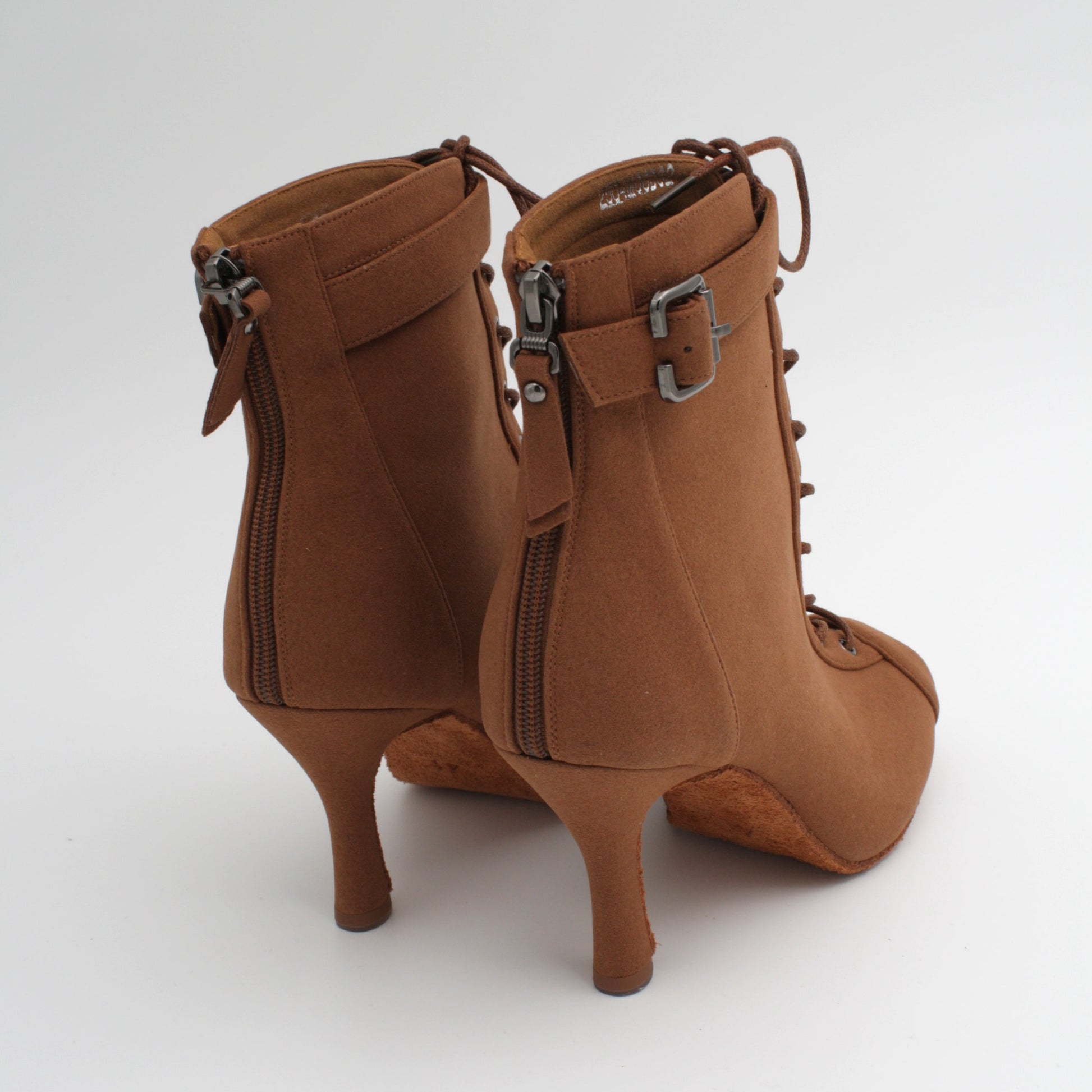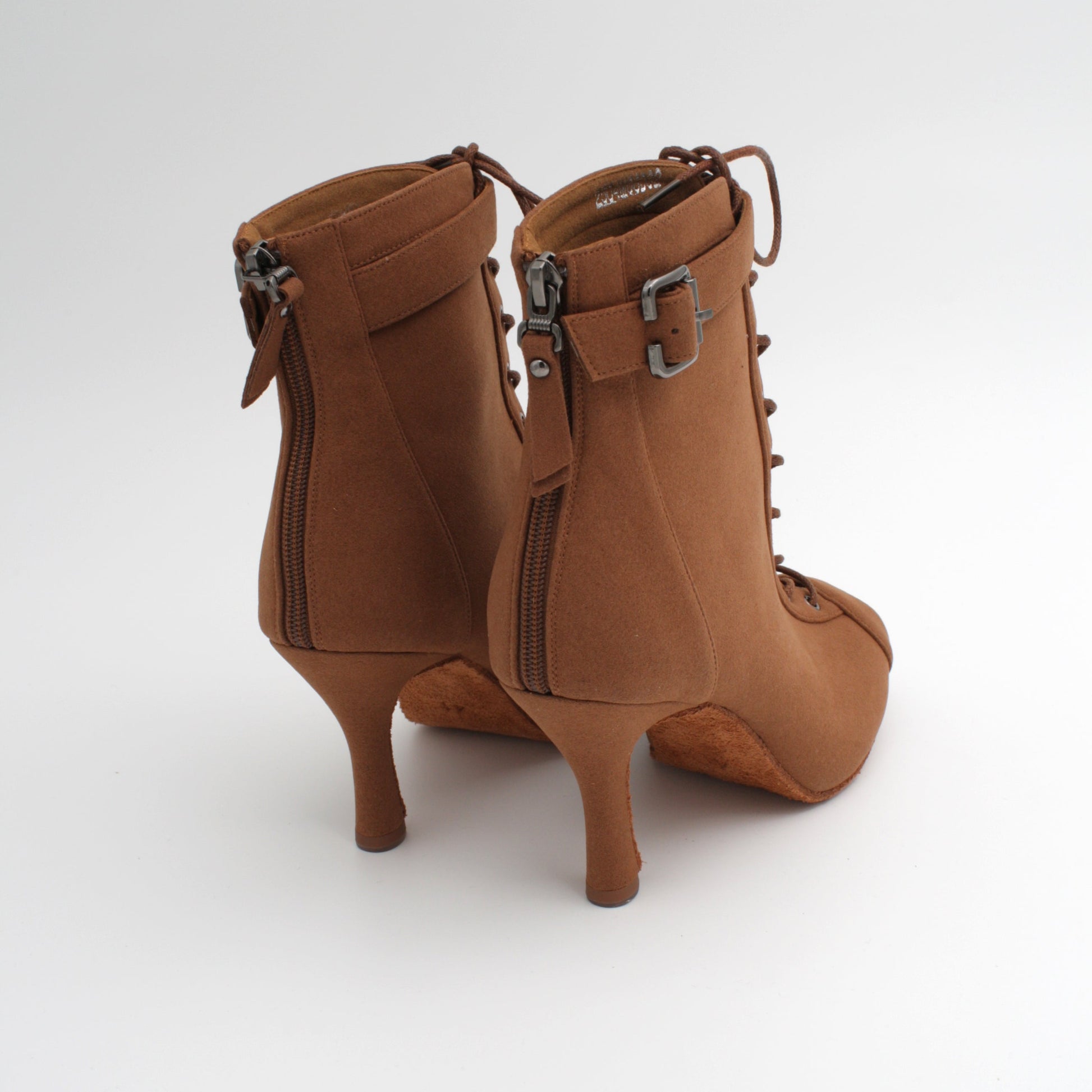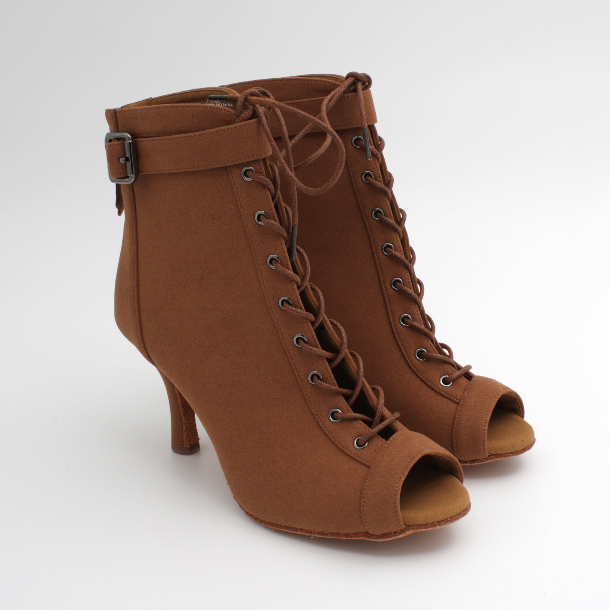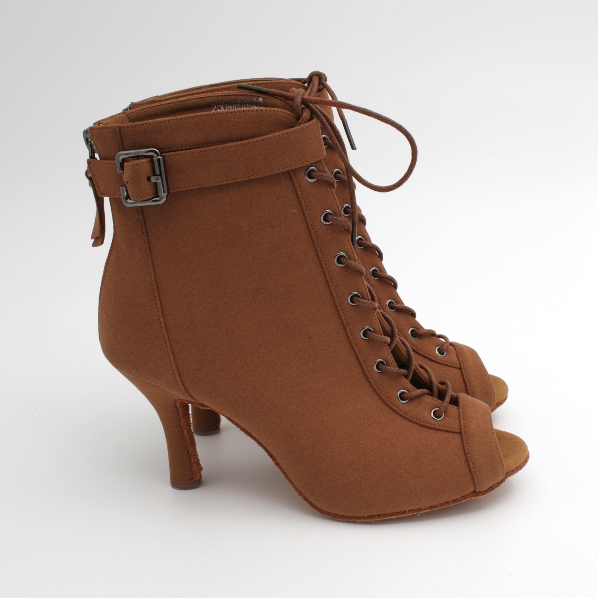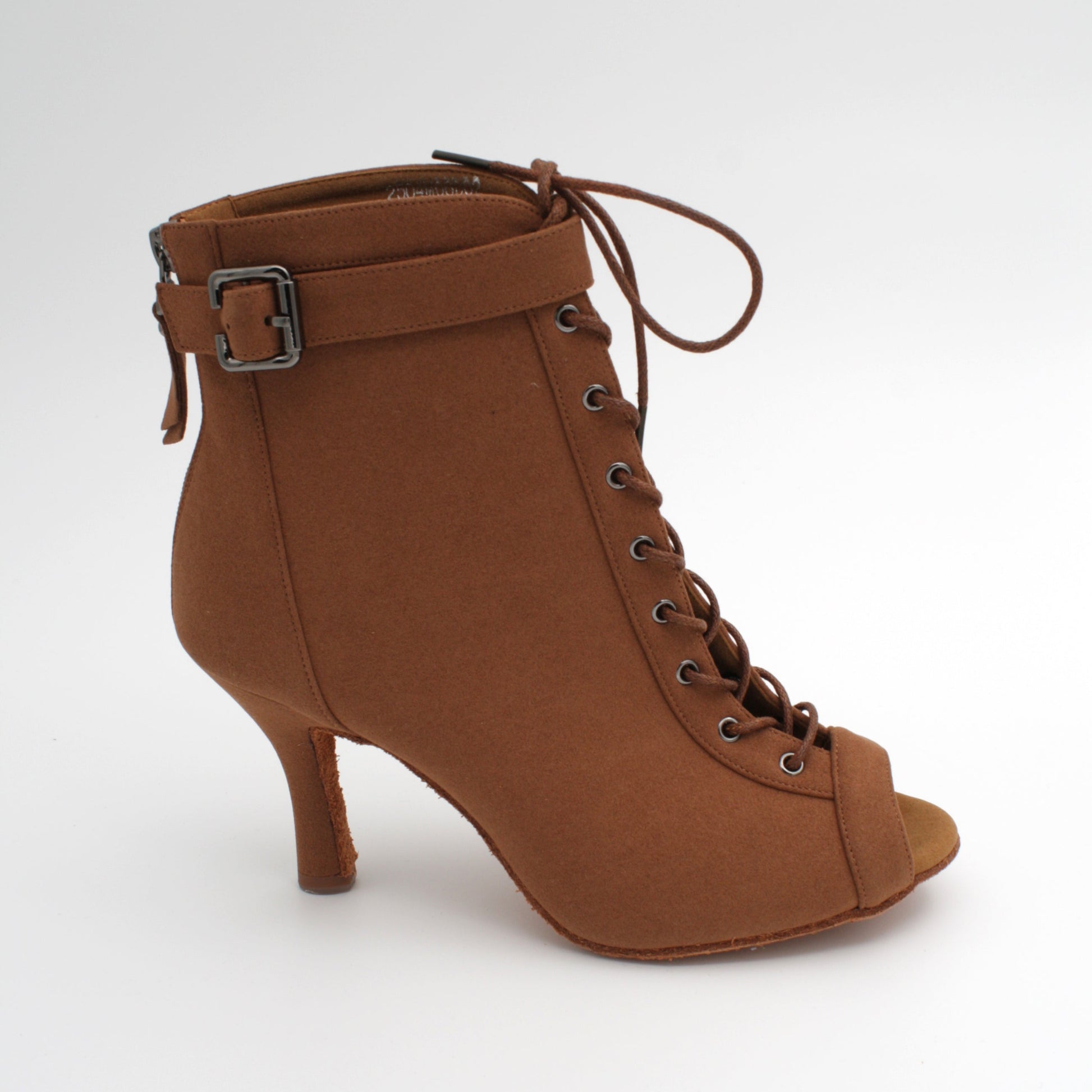 Stilig boot i brun microfiber. Tidløs og elegant med åpen tå, stabil 8,5 cm hel og semsket såle. Et sikkert valg for danser som kizomba, bachata og urbankiz.