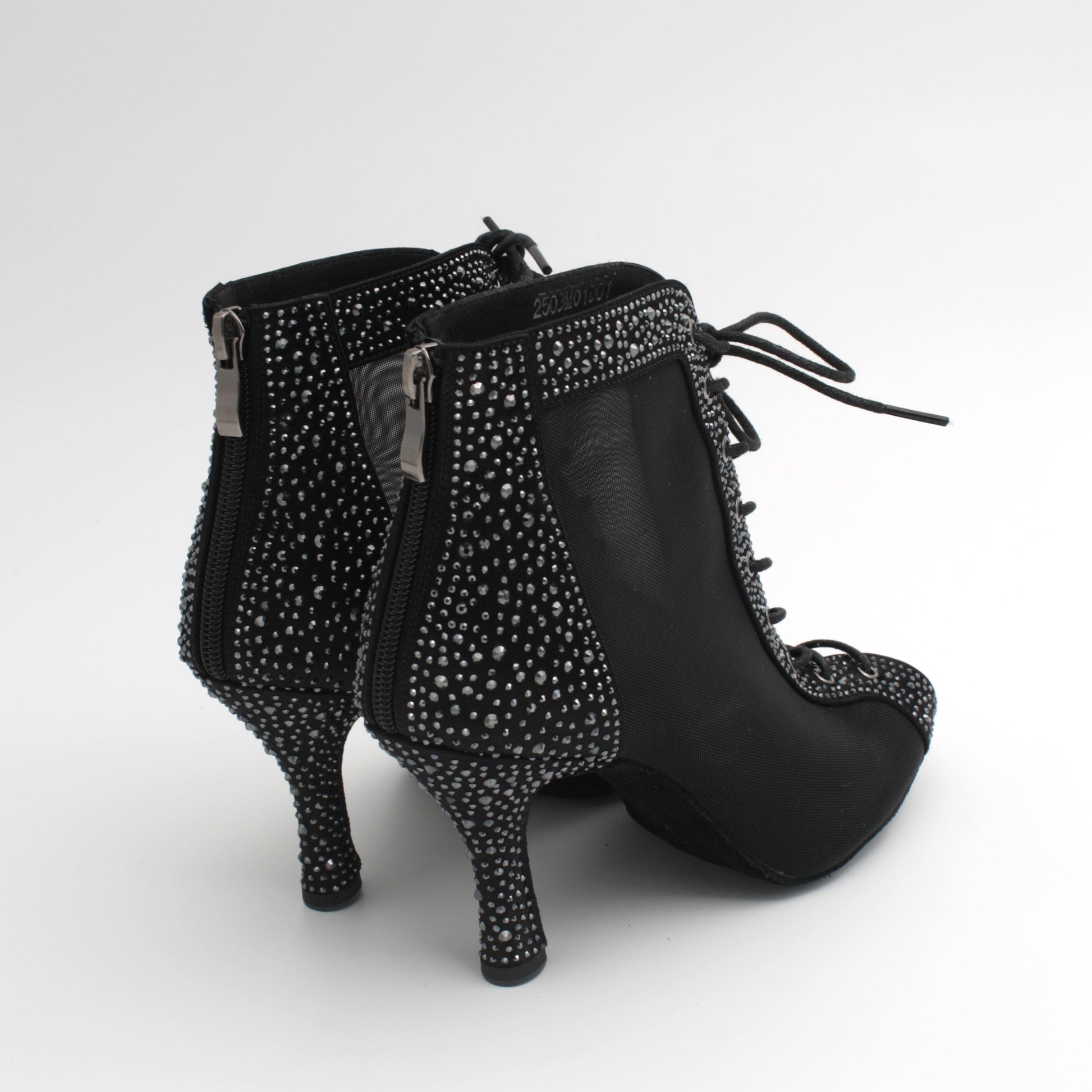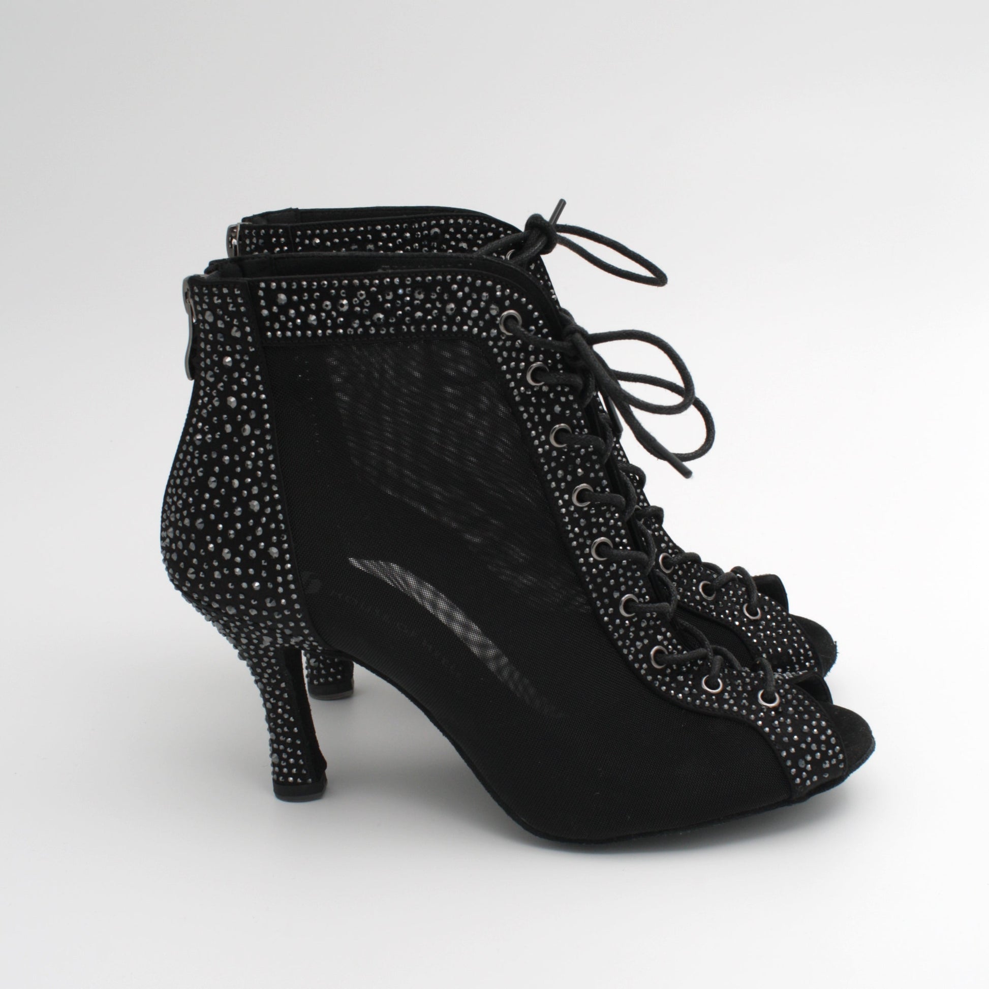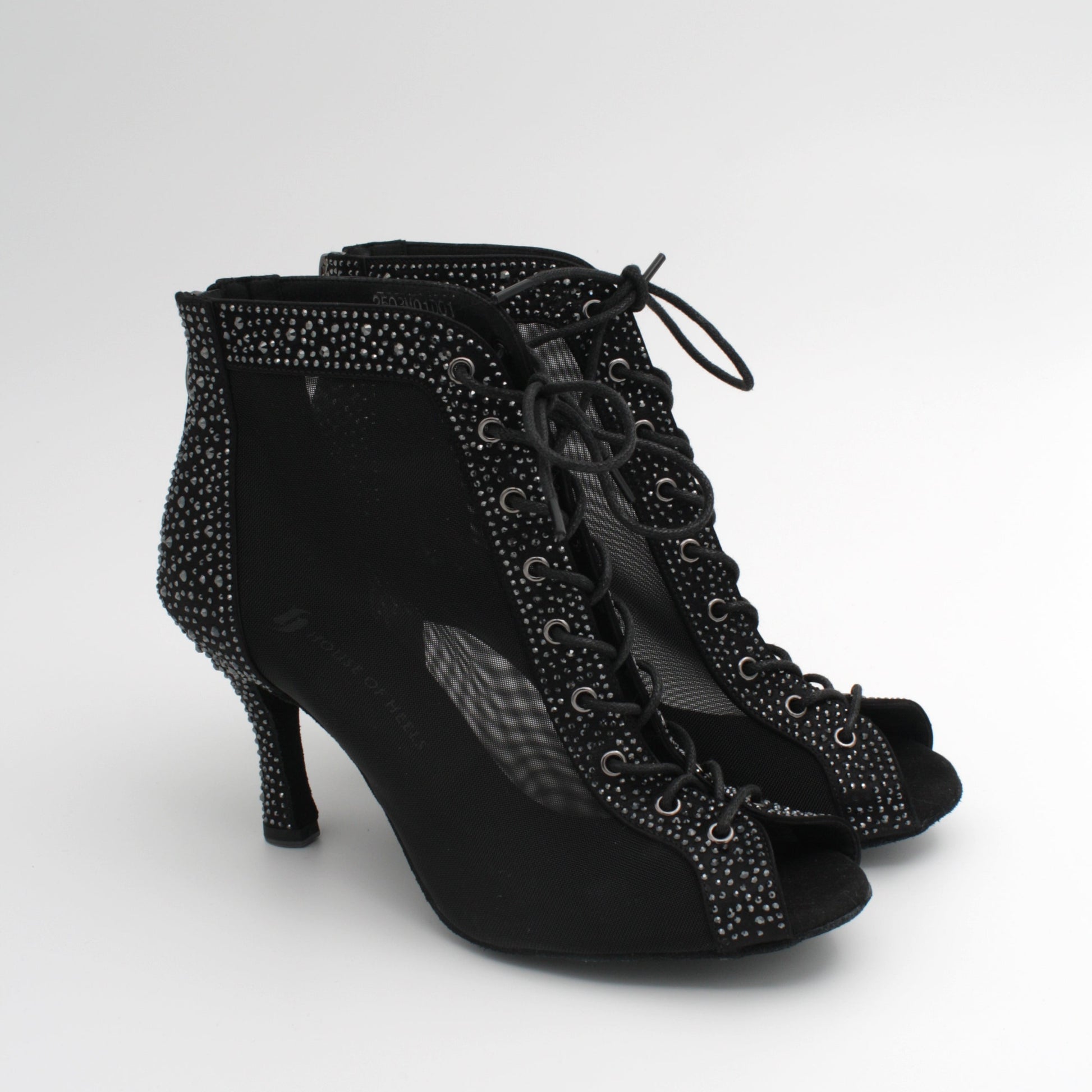 Vår kundefavoritt Hera er sort og mystisk, og dekket i glitrende stener - virkelig nattens dronning. Lekker boot med 8,5 cm hel og pustende mesh. Justerbare snører fra tå til ankel gir perfekt passform. Semsket såle.