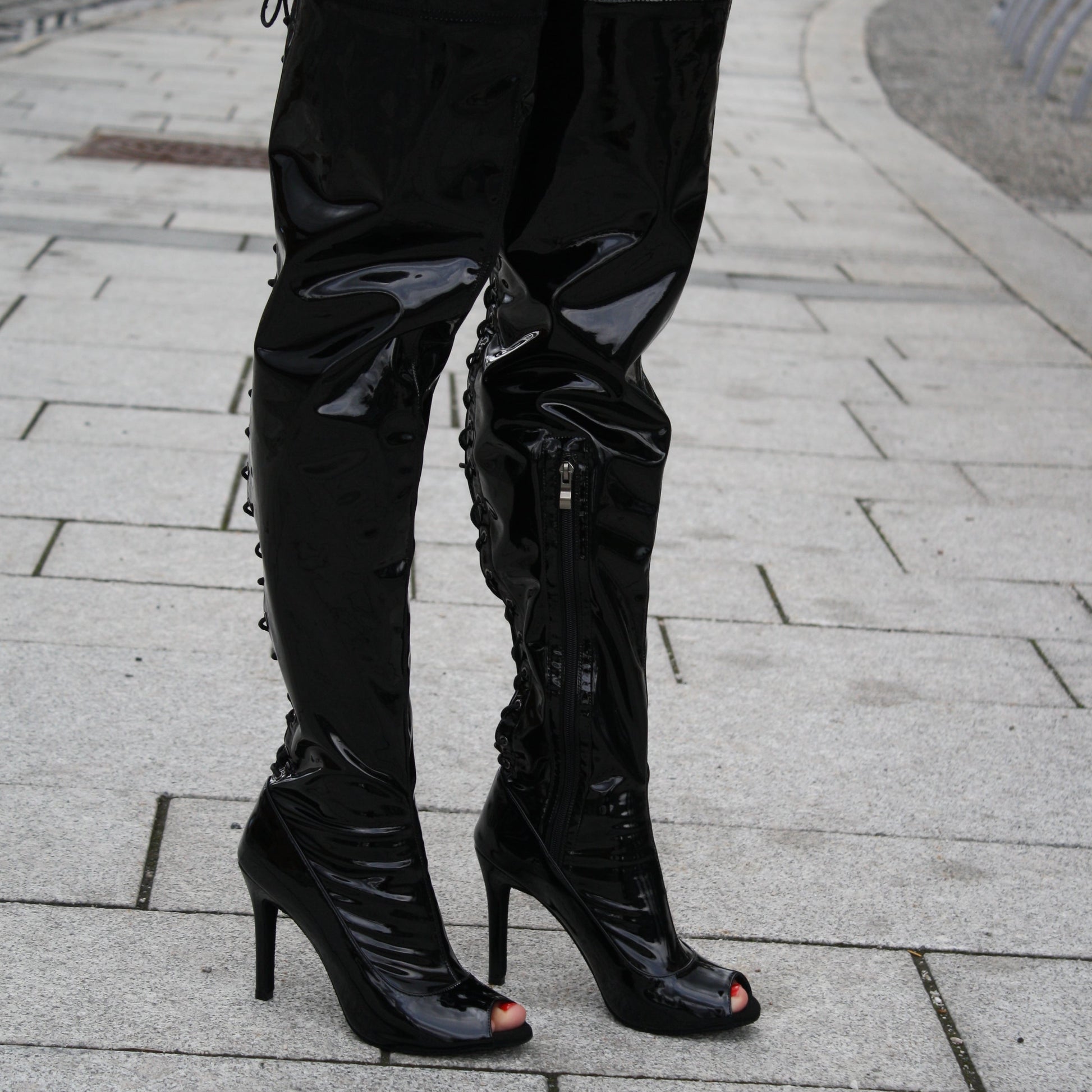 Sort, mystisk og ultrasexy er denne fantastiske lårhøye dansestøvletten. 10 cm stiletthel og semsket såle gjør dette til et perfekt valg for den som vil skille seg ut og gjøre et minneverdig inntrykk. Glidelås og snøring gir gode justeringsmuligheter. Danseskoen for deg som vil gi et tydelig statement!